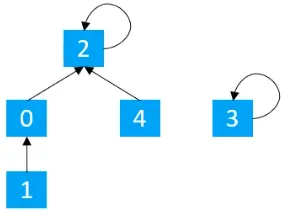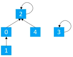 也可以认为,索引对应的元素,代表父节点的索引,所以每一个节点,都有一根线,指向其父节点,所以从这个图,可以看出,0,1,3的父节点都1,所以属于同一个集合。以此类推2表示单独的一个集合