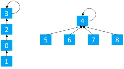 对比前面的路径分裂,路径分裂是每一个节点,都指向祖父节点,路径减半是每隔一个节点就指向祖父节点。那究竟是什么意思呢?例如有下图的集合