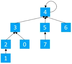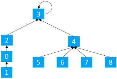 现假设并查集处理的数据都是整型,那么可以用整型数组来存储数据,其中数组的索引代表对应的元素编号,然后数组中存储的数据为该元素对应所在的集合,所以如果用下图来表示对应村庄对应的集合,其中索引代表村庄的标号,编号对应的值代表村庄所在的集合