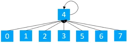 可以发现,执行完find操作后,原来路径上的节点2,3,4都直接指向了根节点,通过这样的优化,树的高度仅进一步降低,所以如果继续执行find(0),find(7)操作,最终在find后,路径上的所有节点,都直接指向根节点,所以最终的结果如下