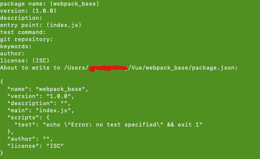 我们可以创建一个文件夹,控制台 cd /Users/**/**/创建的文件名称,执行npm init ,本章就学习webpack默认配置,所以默认选则就行。