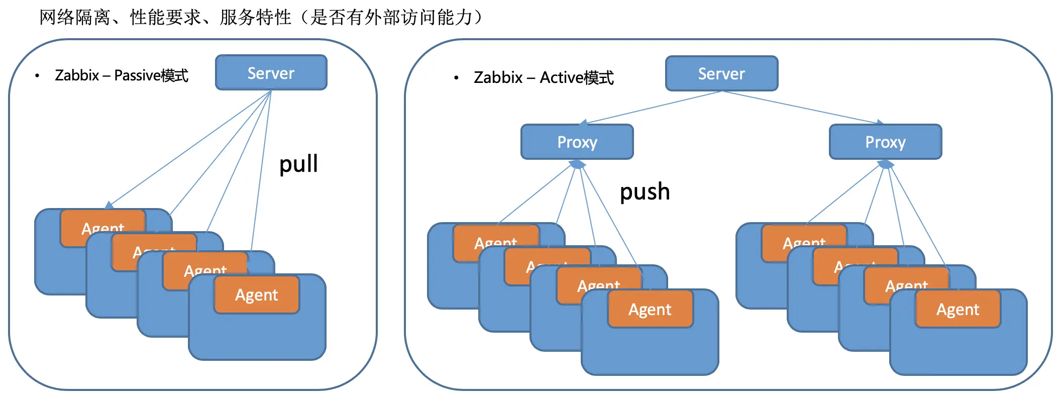 解读:正常的监控系统一般都是采用拉数据的方案,因为由服务器端发起,顺序和过程可控,但是为什么需要拉数据呢? 原因是在几种场景下需要这种能力:网络限制,当出现网络限制时,如安全等保中规定,高安全等级区域可以发起对低安全等级区域的链接,反之则不可以,所以需要从高安全等级区域推送数据至监控服务;性能要求,如同 Zabbix 的 active模式 和 passive模式;服务特性,部分服务并么有对外提供请求接口,则需要内部逻辑对外进行主动 Push 监控数据。为了保证对业务系统和流程全面的监控,我们需要有多种能力的满足;