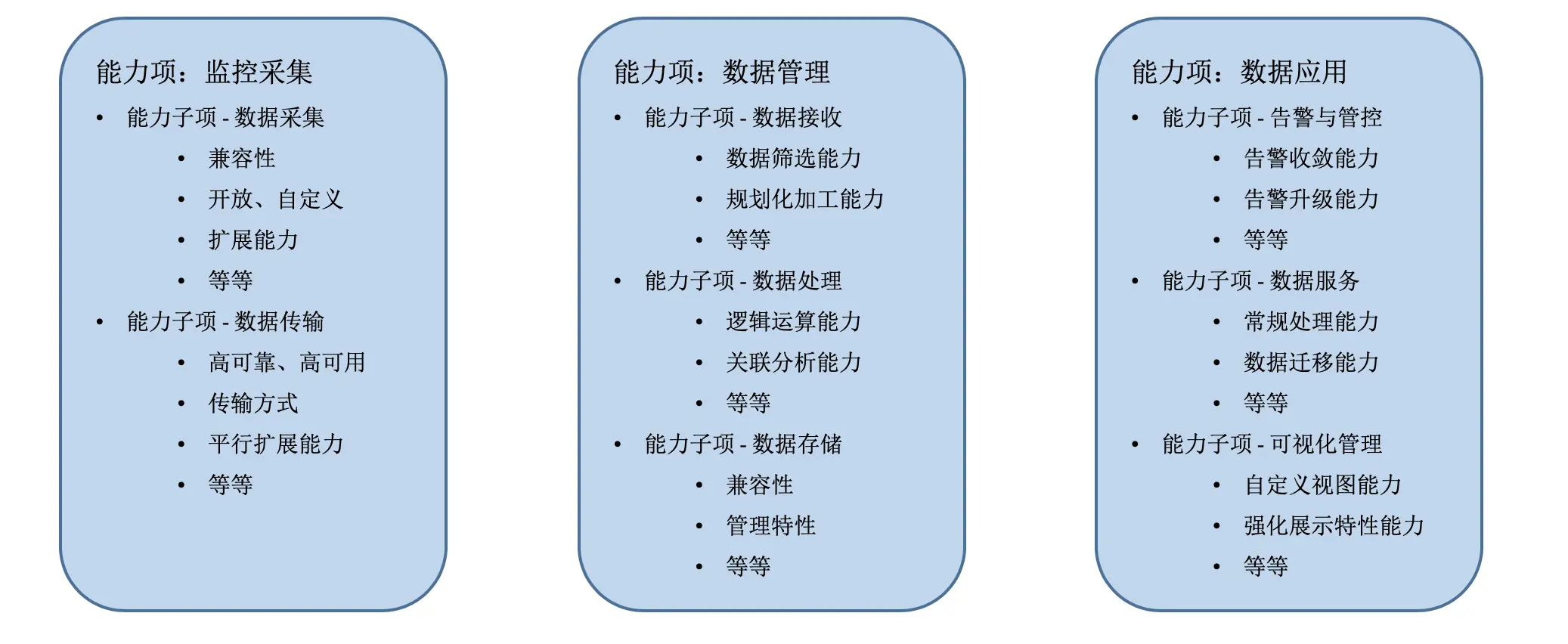 我们发现整个关于“监控管理”的能力项分成三个能力项,分别是“监控采集”、“数据管理” 和 “数据应用” 三个,能力项内又包括了相关的子能力项,我摘取一些我自己觉得很有代表性的点来进行分析: