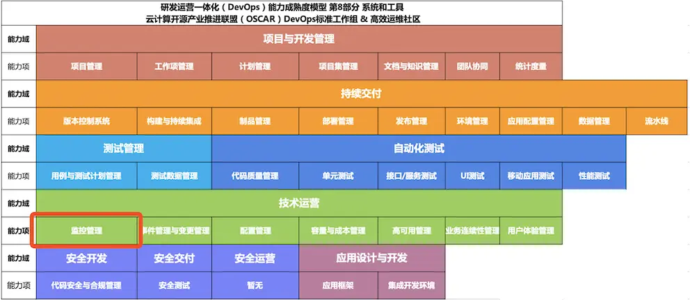 如何看待和提高监控系统的能力,不管是参照开源监控系统对比学习,还是从《研发运营一体化(DevOps)能力成熟度模型》中对比学习,都是一个不错的方向,当然里面的知识点是集合了多数大牛的智慧结晶,本文只是摘取了少量的点进行解读。