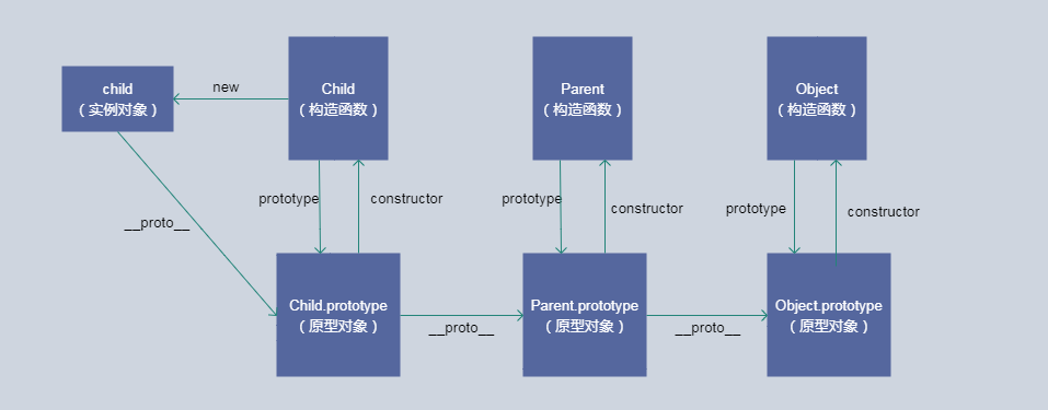 以上代码的继承是通过创建Parent实例,并将实例赋值给Child.prototype实现的。本质是重写原型对象,也就是原本属于Parent实例的属性和方法现在也在Child.prototype中了。