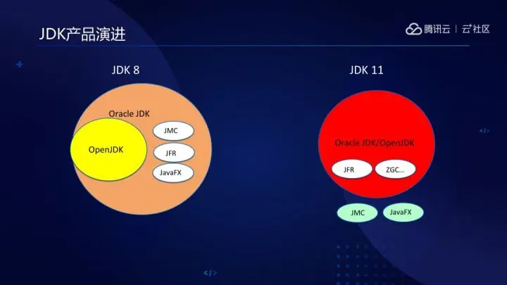 但发展到JDK11之后,整个JDK的产品形态发生了一个很大的变化,从一个大的单体应用,作了一定的解耦,JMC、OpenJFX等以软件包的形式独立于JDK之外,Oracle也将其商业特性都开源了出来,所以Oracle JDK 11和OpenJDK 11仅存在License的不同。