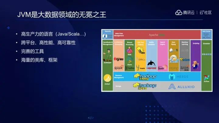 大家知道,主流大数据技术栈,要么是基于Java,要么是运行在JVM之上。Java和JVM提供的易用的语法、跨平台能力、广泛的工具、类库等等,让JVM成为大数据领域的无冕之王,目前来看几乎没有同等竞争对手。