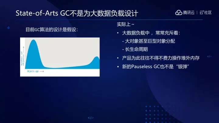 从大数据负载特点来看,经典GC算法存在一定程度的水土不服。我们知道目前的年代等设计,本就是基于一个实践经验“大部分对象较小并且生命短暂“,但是,在Spark SQL等大数据负载,经常可以见到大量的长生命周期大对象甚至超大对象分配。