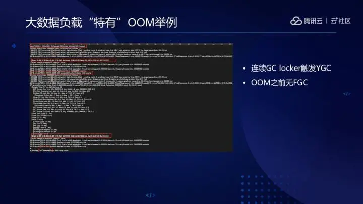 我们在生产实践中注意到,大数据应用中JNI进入临界区,GC Locker触发频繁的无意义Young GC与大对象分配合力,会导致JVM意外OOM,这个问题在大数据场景比较频繁,具体可以参考下图。
