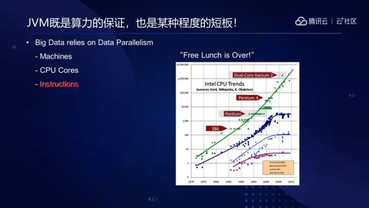 大数据依赖于机器(集群)、线程(多核)和指令(SIMD)三种层次的数据并行计算。大概是2002年以后, CPU Core的频率已经基本上没有明显上升,甚至有所下降,生产负载扩展性越来越依赖于堆CPU、堆机器。分布式集群和多线程必不可少,但JVM层面在指令级别的优化尚未得到充分重视,充分利用指令并行能力是算力的保障之一。