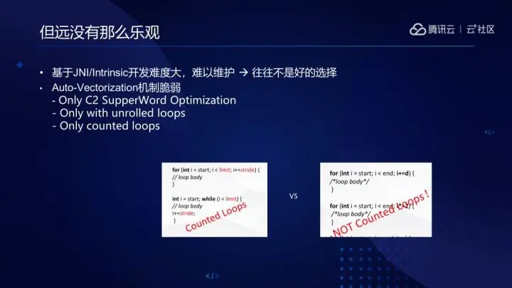 但是Auto-Vectorization能力局限性也很多,目前仅在C2提供 SupperWord Optimization,依赖于Counted Loop的Loop Unrolling,开发有难度且比较脆弱。