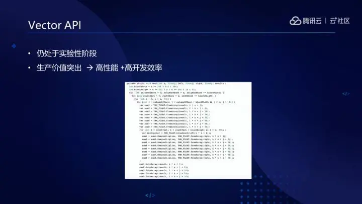 目前,OpenJDK孵化中的Vector API能够大大提高开发效率,进而提高性能,未来我们将积极推动其发展和成熟。
