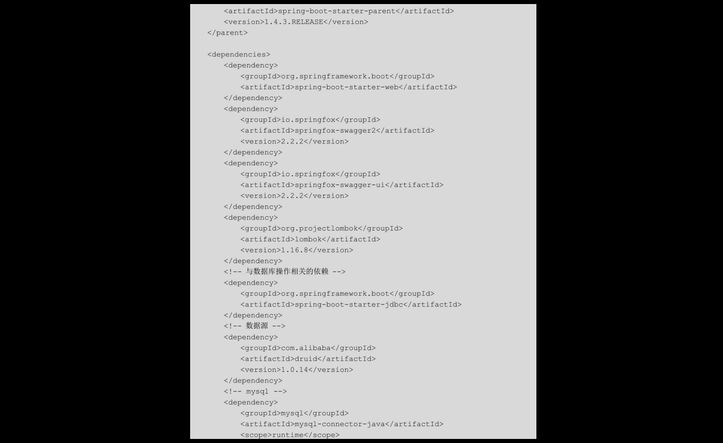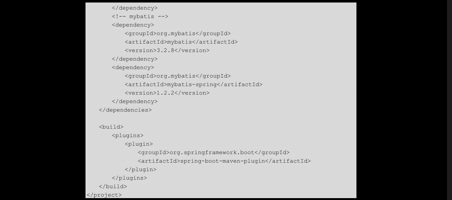 在该文件中引入了与数据库相关的5个包:spring-boot-starter-jdbc、druid、mysql-connector-java、mybatis及mybatis-spring。其中,mysql-connector-java的scope是runtime,使用的数据源是阿里巴巴的Druid。