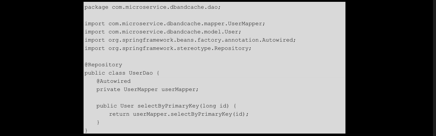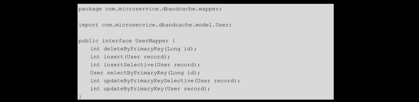Spring Boot与MyBatis集成之后,遵循最基本的分层架构。设计了三个类:一个dao、一个service和一个controller。 首先是com.microservice.dbandcache.dao.User.Dao,代码如下: