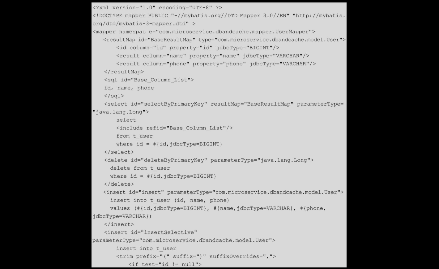 MyBatis-Generator生成的第三个模板文件是src/main/resources/mapping/UserMapper.xml,代码如下: