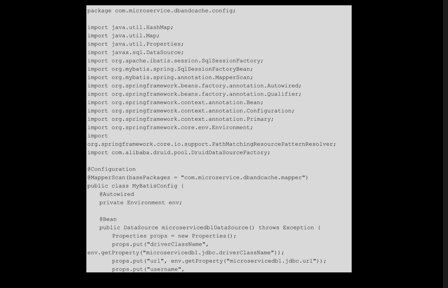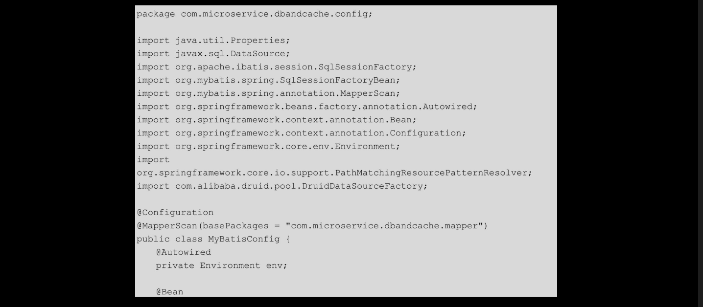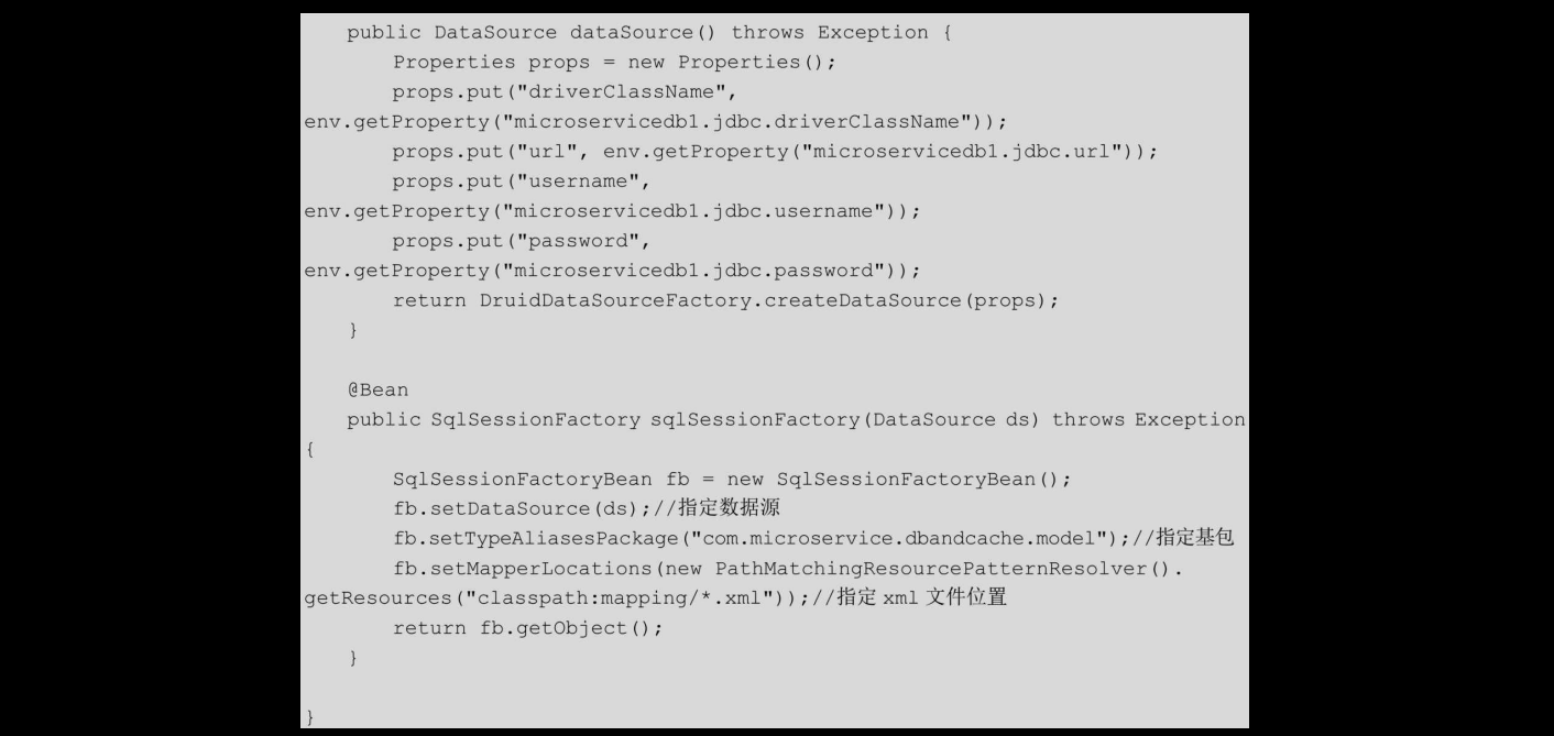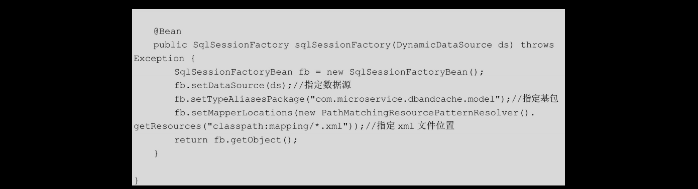 然后,在com.microservice.dbandcache.config.MyBatisConfig类中,构造动态数据源,集成MyBatis,代码如下: