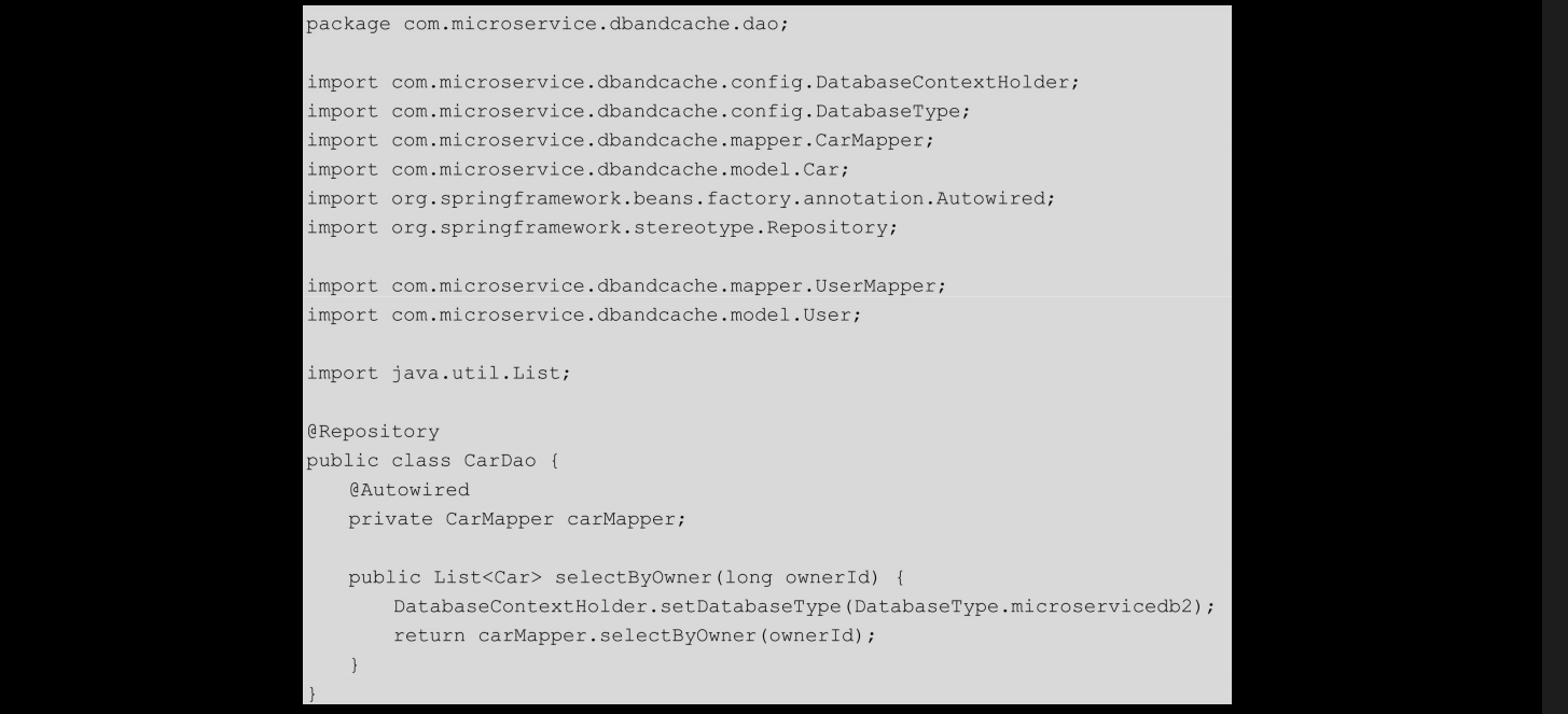 然后依然根据分层规则,编写dao、service和controller类。 com.microservice.dbandcache.dao.CarDao代码如下: