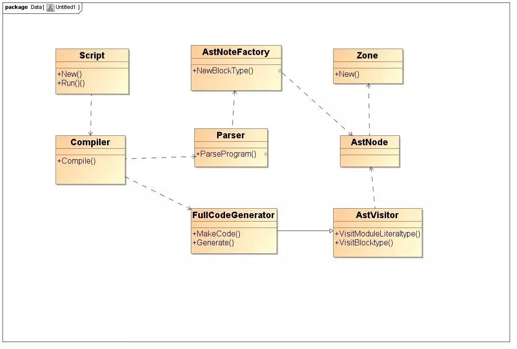 - Compiter:编译器类,辅助Script类来编译生成代码,它主要起一个协调者的作用,会调用解析器(Parse)来生成抽象语法树和全代码生成器,来为抽象语法树生成本地代码;