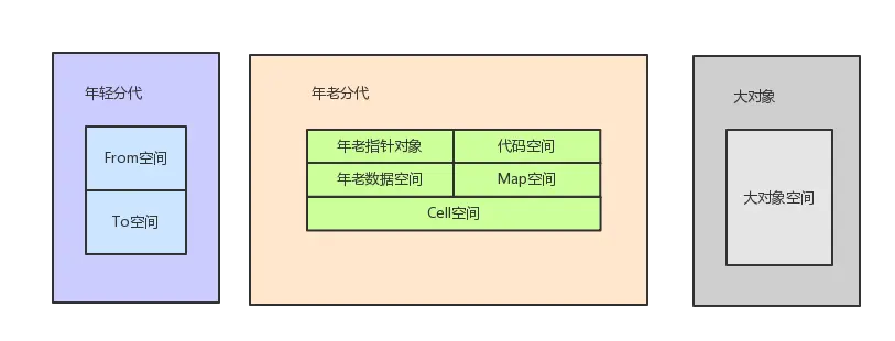 堆:V8使用堆来管理JavaScript使用的数据,以及生成的代码,哈希表等;为了更方便的实现垃圾回收,同很多虚拟机一样,V8将堆分成三个部分,第一个是年轻分代,第二个是年老分代,第三个是大对象保留的空间;如下图:
