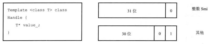 在V8中,数据的表示分成两个部分,第一个部分是数据的实际内容,他们是变长的,第二部分是数据的句柄,句柄的大小是固定的,句柄中包含指向数据的指针。为什么要这样设计呢?主要是因为V8需要进行垃圾回收,并需要移动这些数据内容,如果直接使用指针的话就会出问题或者需要比较大的开销,使用句柄的话就不存在这些问题,只需要将句柄中的指针修改即可。