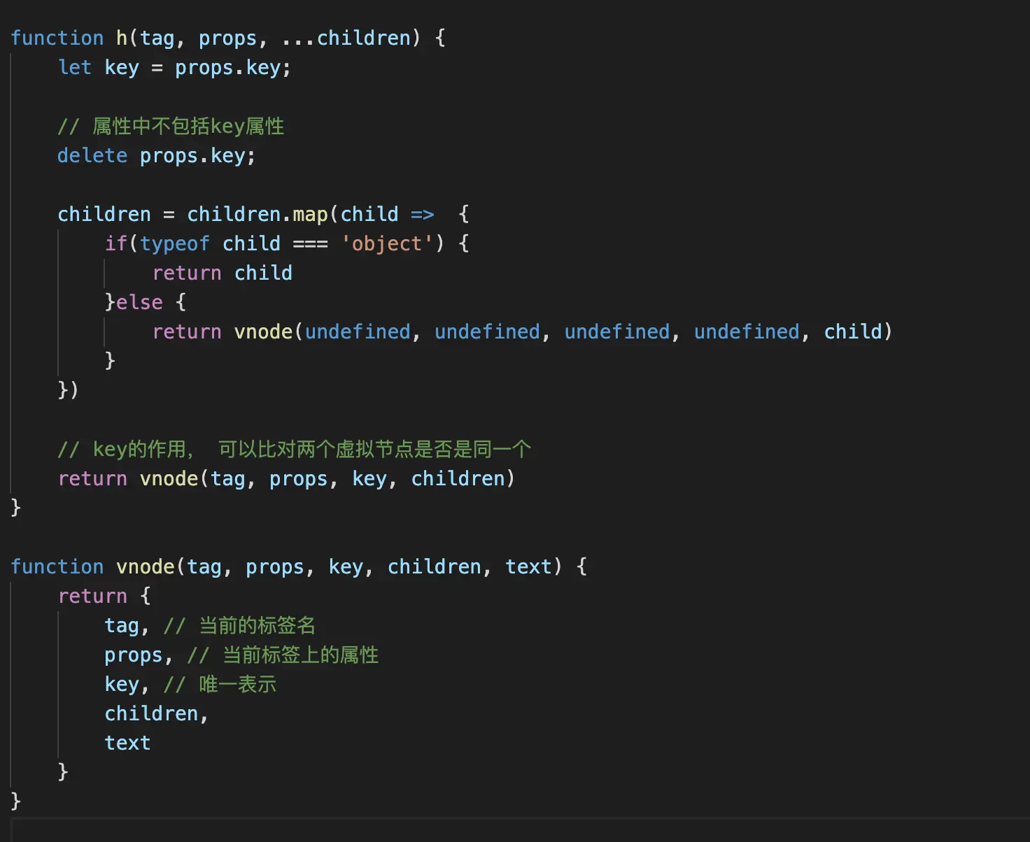 - h:把传入的参数变为虚拟dom。 虚拟dom入口方法, 用户可以调用这个方法,