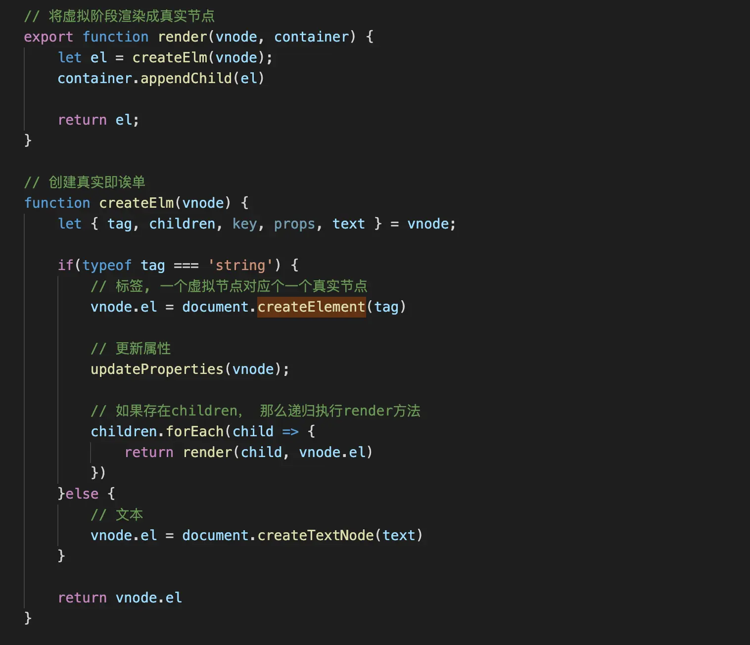 render函数的作用是把h函数转化成的vnode, 第一层开始, 一次递归把vnode转化成真实dom