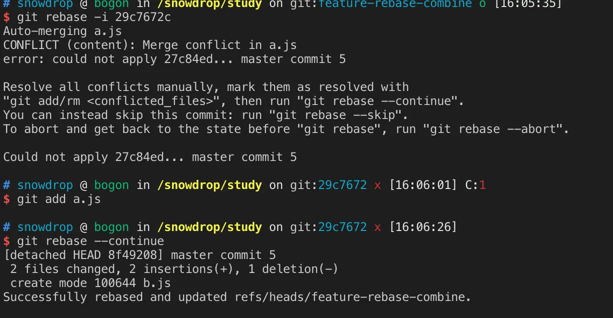 git rebase master之后提示b.js有冲突,手动解决后,执行git rebase --continue,又提示一次让解决b.js的冲突,重复上述操作后,最终feature分支的提交历史如下图