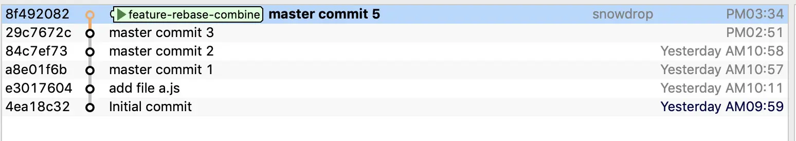 从上图我们可以看出,整个master分支移动到了feature分支上,且没有使用一个代表 merging 的 commit,整个项目提交历史很清晰。