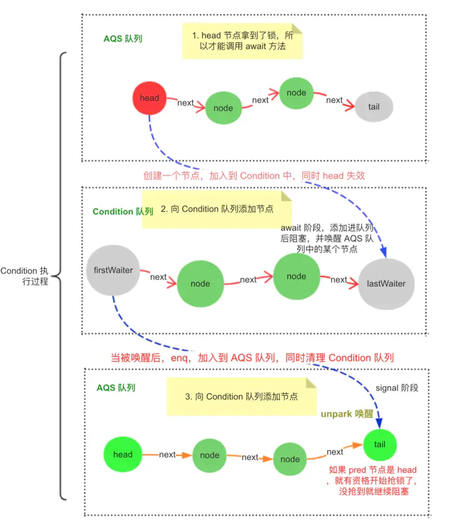 await()方法的线程,会被加入到ConditionObject等待队列中,并且唤醒同步队列中head节点的下一个节点 2) 线程在某个ConditionObject对象上调用