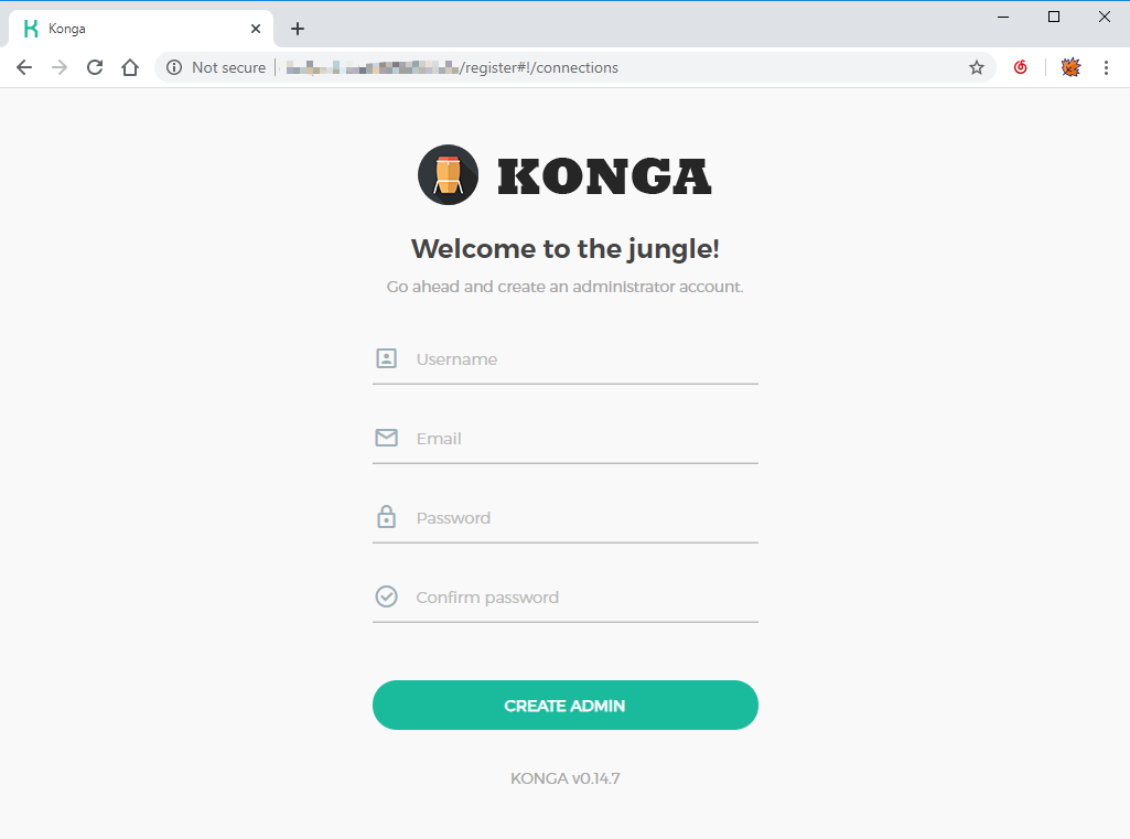 在以上创建命令执行后大概1-2分钟,浏览器访问http://konga.example.com,出现konga注册页面说明已经部署成功。