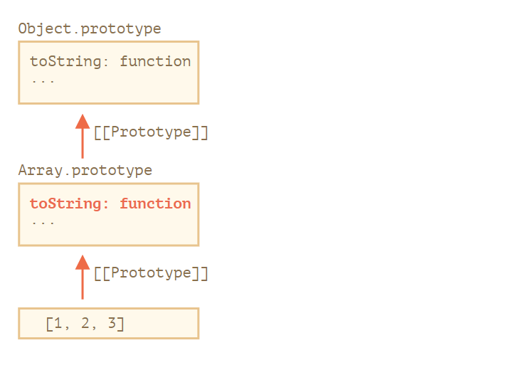 一些方法在原型上可能会发生重叠,例如,Array.prototype 有自己的 toString 方法来列举出来数组的所有元素并用逗号分隔每一个元素。