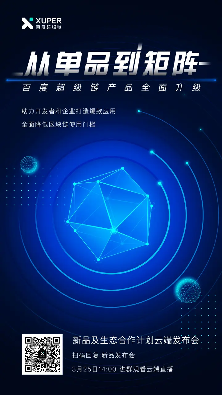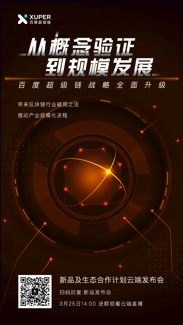 百度超级链新品及生态合作计划云端发布会 百度超级链 2020-03-16 260 阅读1分钟 区块链技术落地难?应用难? 什么样的产品能降低技术应用的门槛? 什么样的产品和企业战略可以推动产业规模化发展? 从概念验证到规模化发展, 怎样才能加速实现区块链技术普及? 百度超级链新品及生态合作计划云端发布会,即将揭秘,席位有限,扫码进群! 从单品到矩阵、从携手到赋能、从概念验证到规模发展, 建立区块链产业价值利益共同体, 2020一起赢! 时间:2020年3月25日 14:00地点:云端发布会微信社群