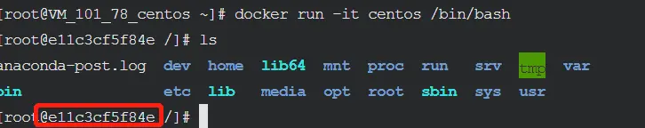 这个时候可以看到命令行的前端已经变成了 [root@(一串 hash Id)] 的形式, 这说明我们已经成功进入了 CentOS 容器。