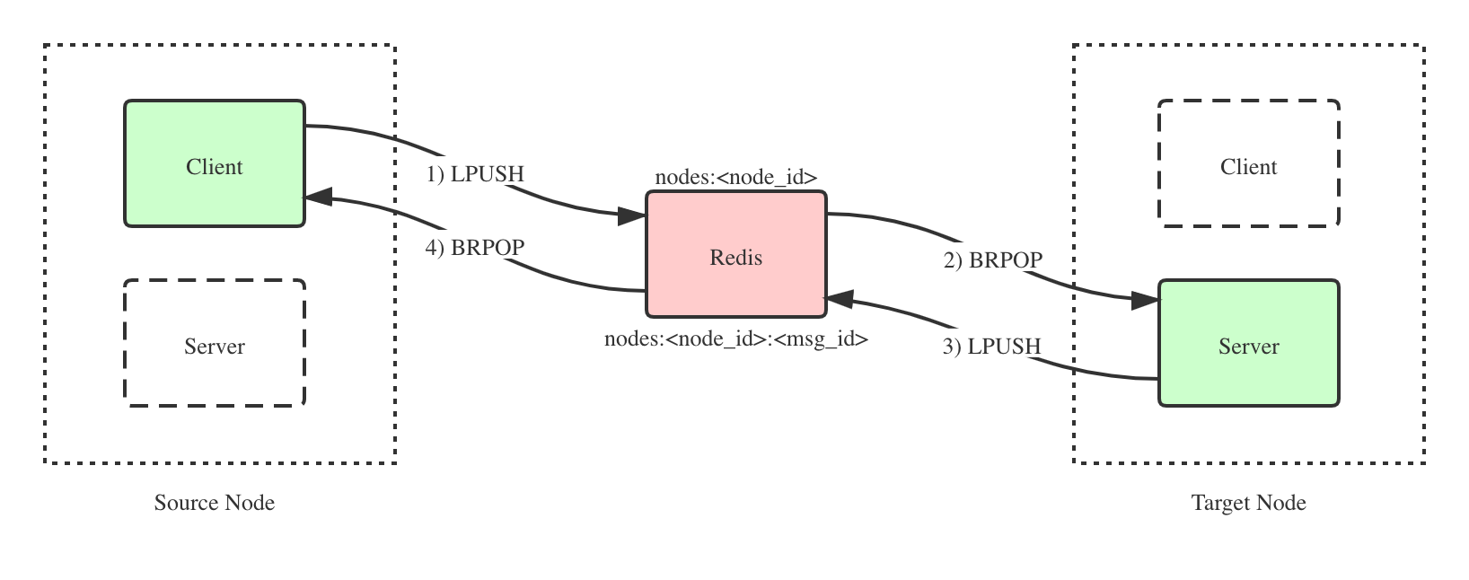 LPUSH将消息推送到 Redis 的nodes:<node_id>中,并执行BRPOP nodes:<node_id>:<msg_id>阻塞并监听这个消息队列; - 目标节点的服务端通过