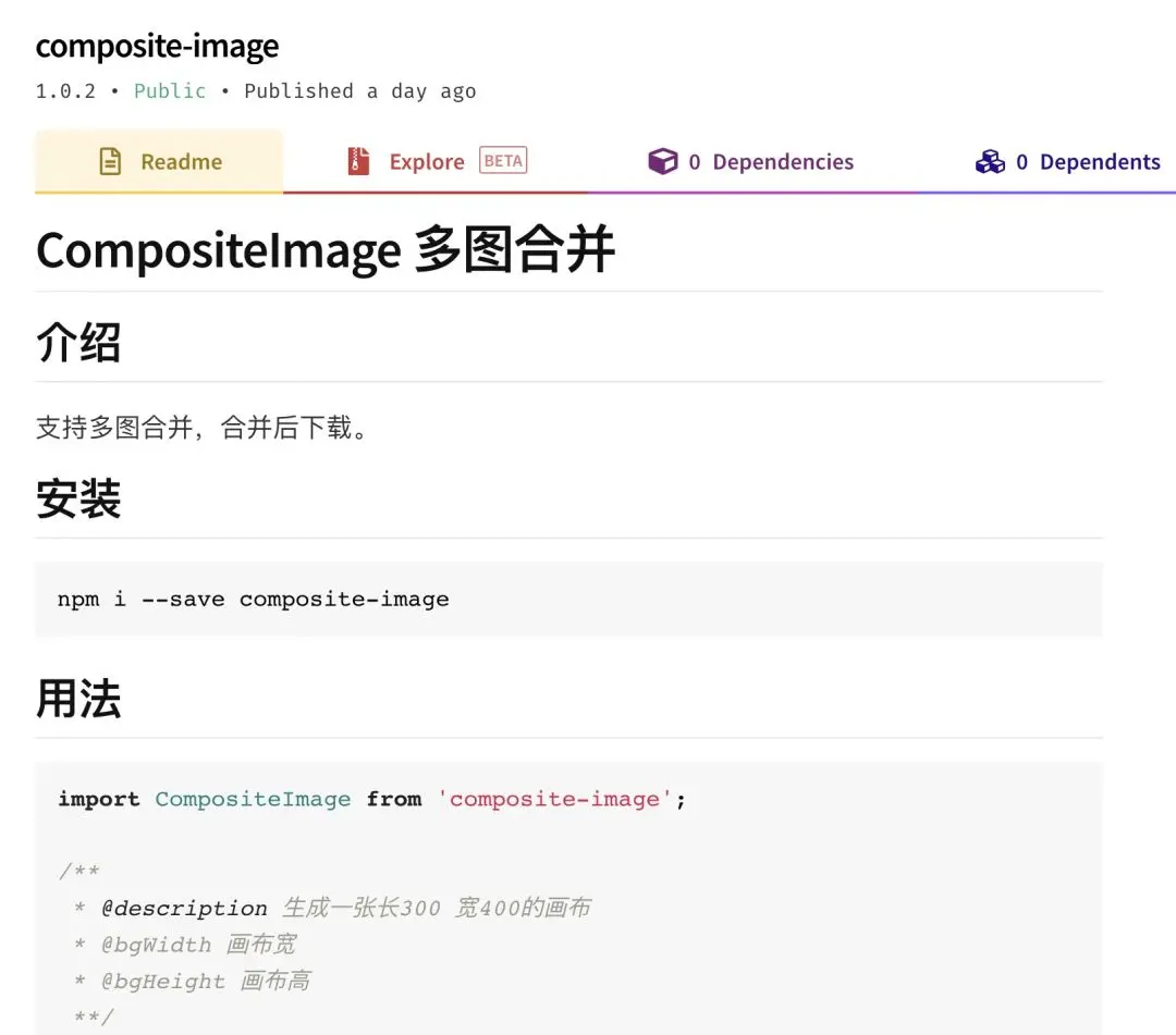 目前我已经将上述组合图片的功能做成了开源package,上传至npm源上,如果有有需要的可以使用以下命令直接使用。