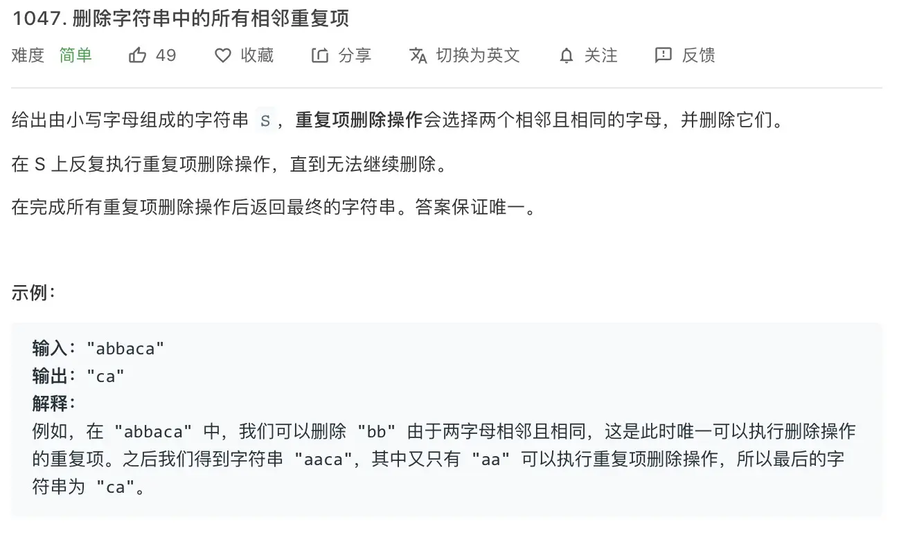 leetcode 1047. 删除字符串中的所有相邻重复项