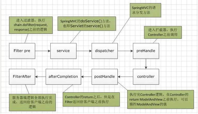 另外,还有一个跟拦截器类似的东西----Filter。Filter是Servlet规范规定的,不属于spring框架,也是用于请求的拦截。但是它适合更粗粒度的拦截,在请求前后做一些编解码处理、日志记录等。而拦截器则可以提供更细粒度的,更加灵活的,针对某些请求、某些方法的组合的解决方案。