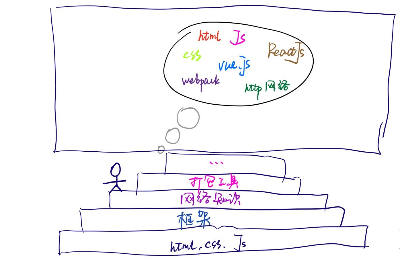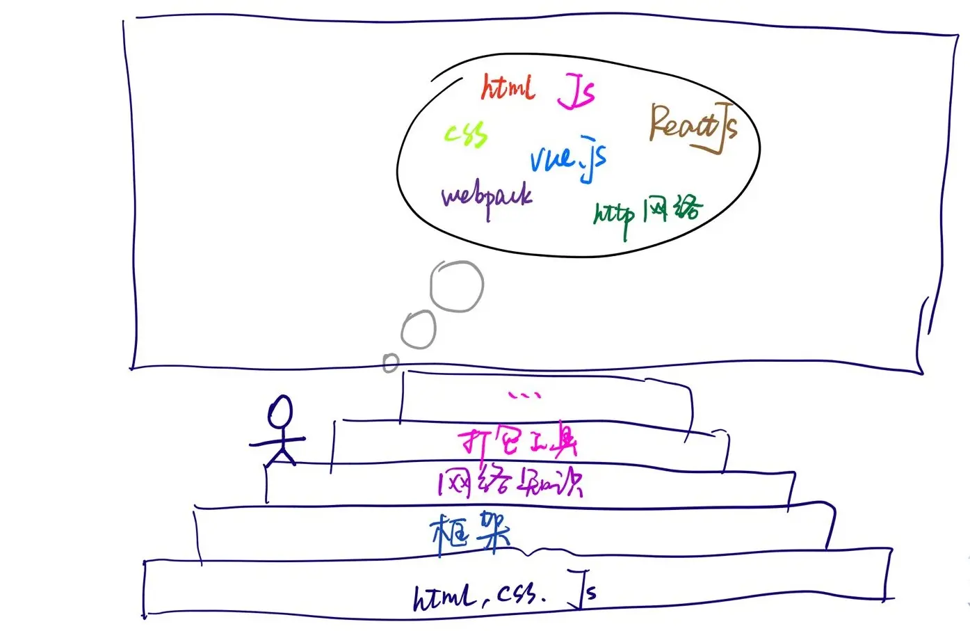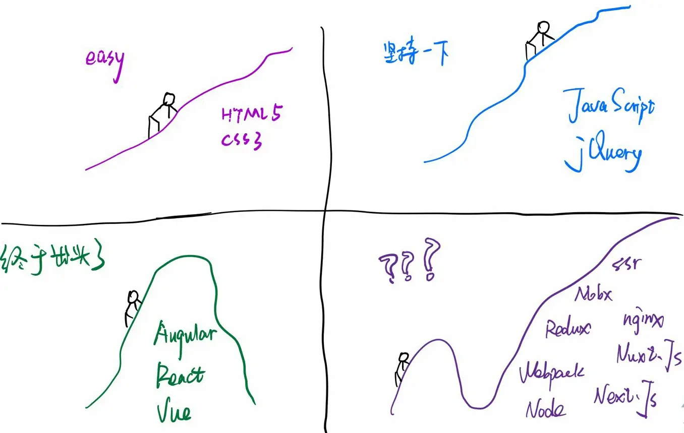我们从最基本的前端基础知识开始讲起,这里也是我们最初的出发点。在这个过程当中呢,你会觉得前端的世界是那么的小,做什么事情都是的得心应手的,一度沉浸在自己的世界里不能自拔。你自己想走出去,但是又害怕外面的世界,所以你可能会在这里徘徊一段时间,等你觉得自己可以有信心打怪升级的时候自然会攀越过去。