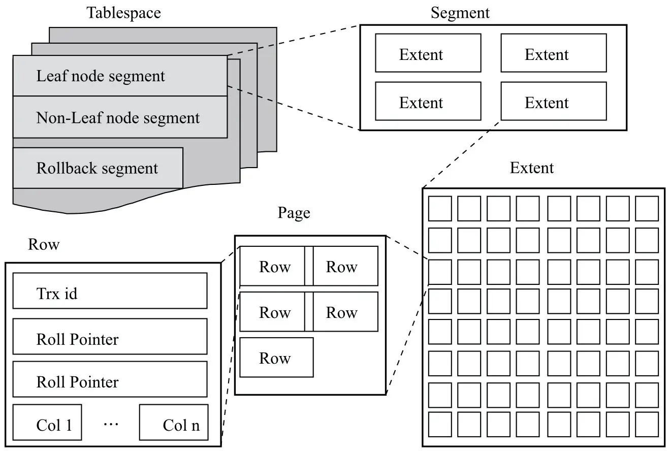 页的数量随着表数据的增多逐渐增大,便有了区的概念,区就是一系列页的集合,有了区的概念之后在为索引分配空间的时候就从原来的按页为单位分配,转变为按区为单位分配,甚至是当表数据量非常大的时候可以一次性连续分配多个的区,这样做的好处上面已经解释过。当区的数量也增多的时候,我们都知道B+树是有区分叶子节点和非叶子节点的,而如果区不对此做区分的话,就会出现有的叶子节点在A区,有的叶子节点在B区,这样当我们需要进行范围查询的时候查询性能可能就会比较差。于是便又有了段的概念,可以把段简单理解为区的集合,我们将段区分叶子节点段和非叶子节点段(实际还有回滚段等),这样区也便被划分成了叶子节点区和非叶子节点区,叶子节点区的数据尽可能物理邻近存放,可以提升查询效率。页、区、段的概念都有了,在它们的最上层再套上一个表空间(对应于一张或多张表)的概念也就并不奇怪了。