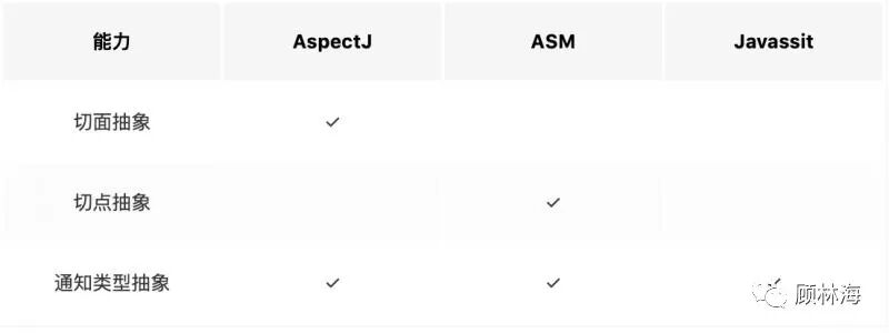 其次,我们需要关注这些框架具备哪切面编程的能力,这有助于帮助我做技术选型,由于AspectJ、ASM 、Javassit是相对比较完善的AOP框架,因此只对三者进行比较。