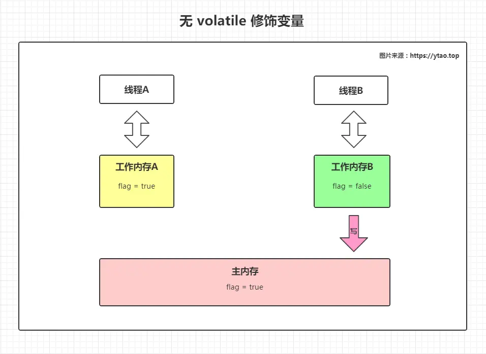 当 A 线程读取到 flag 的初始值为true,进行 while 循环操作,B 线程将工作内存 B 里的 flag 更新为false,然后将值发送到主内存进行更新。随后,由于此时的 A 线程不会主动刷新主内存中的值到工作内存 A 中,所以线程 A 所取得 flag 值一直都是true,A 线程也就为死循环不会停止下来。