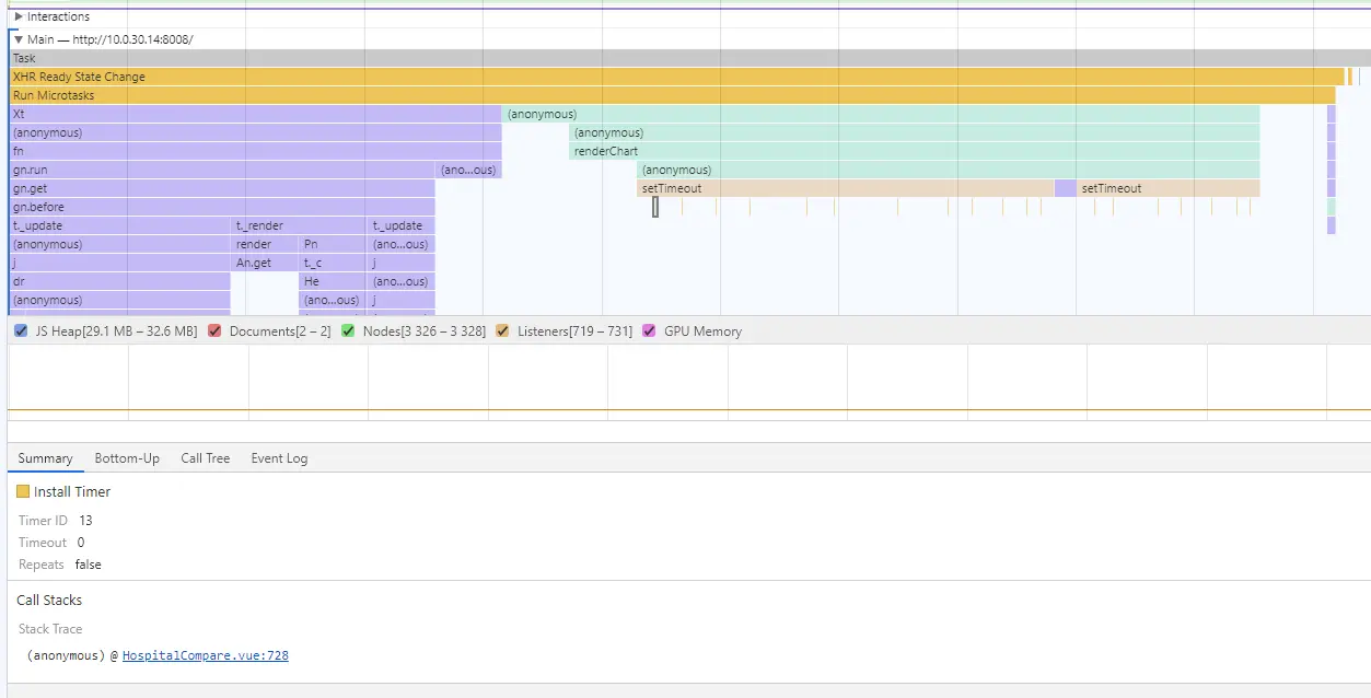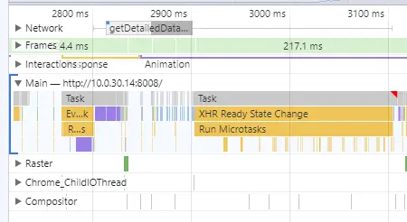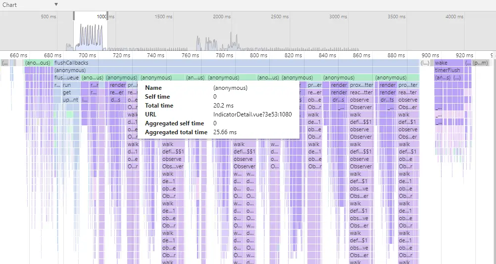 Warning Recurring handler took 68.25 ms的提示,意思就是循环操作性能损耗太严重,箭头指向的黄色款右上角也有红色三角形标识Initiator Reveal标识了操作来源,点击跳转到下面详细的调用栈 - 图中X轴每一个横条都代表一个事件,长条的宽度代表所花费的时间,越长花费越久;y轴表示调用堆栈,事件相互叠加时,较高的时间导致较低的事件。