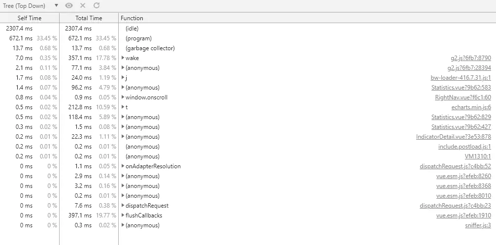 很常见的火焰图,鼠标移到对应色块上会显示详细信息,点击对应条块会根据URL属性直接跳到对应文件。