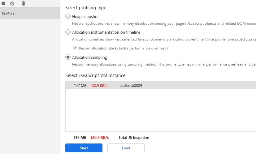 - allocation sampling 内存信息采样,使用采样的方法记录内存分配。此配置文件类型具有最小的性能开销,可用于长时间运行的操作。它提供了由 javascript 执行堆栈细分的良好近似值分配。