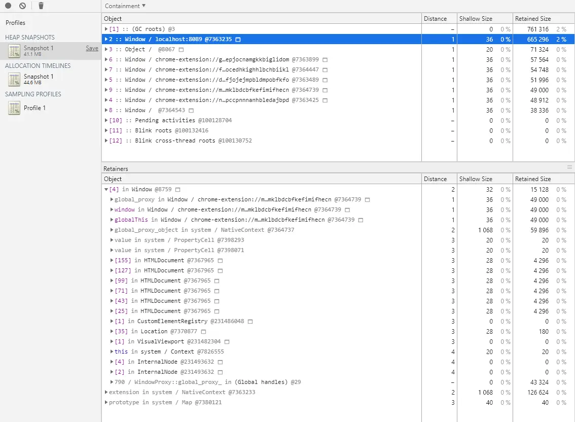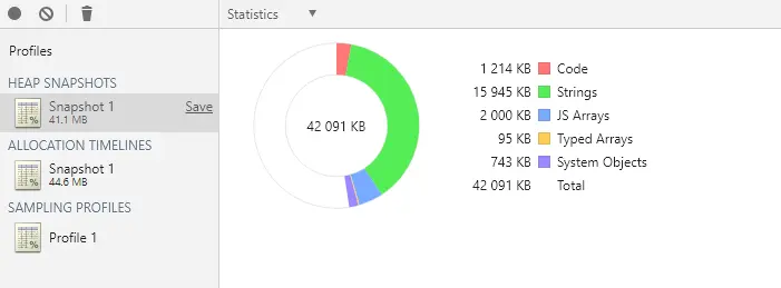 - Summary - 可以显示按构造函数名称分组的对象。使用此视图可以根据按构造函数名称分组的类型深入了解对象(及其内存使用),适用于跟踪 DOM 泄漏,如上图。