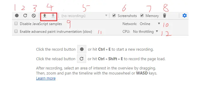 监控页面内存相关 与JavaScript profile面板基本一样,不同的是左侧选项,三个选项分别是