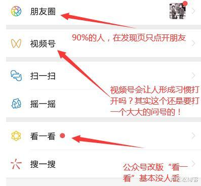 就拿最近一个案例来说,公众号去年为了挽救行业越来越走低的阅读,把文章“点赞”改成“再看”同步到发现页的“看一看”当中,但是这一招并没有什么效果,大部分用户还是不去点开看一看的,发现页90%的人只看朋友圈。