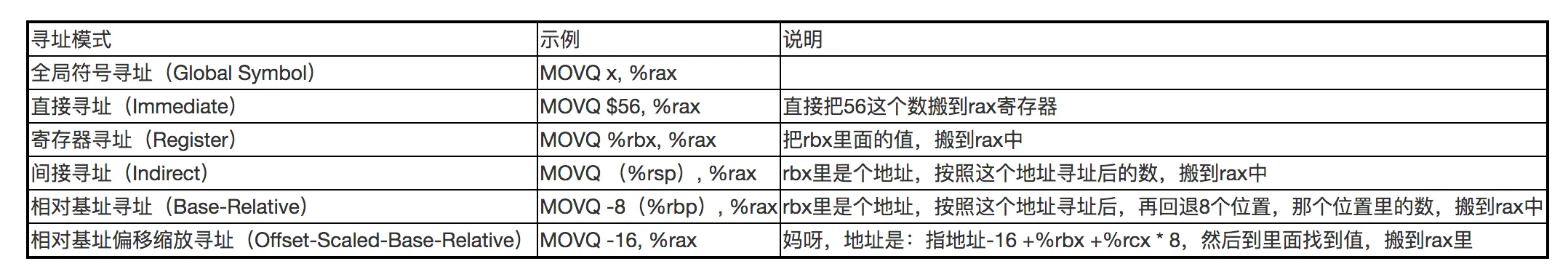 接下来说说寻址,**寻址就是告诉CPU去哪里取指令、数据。**比如movl %rax %rbx,这个涉及到寻址,寻址会寻“寄存器”、“内存”,可以是暴力的直接寻址,也可以是委婉的间接寻址。下面是各种寻址方式: