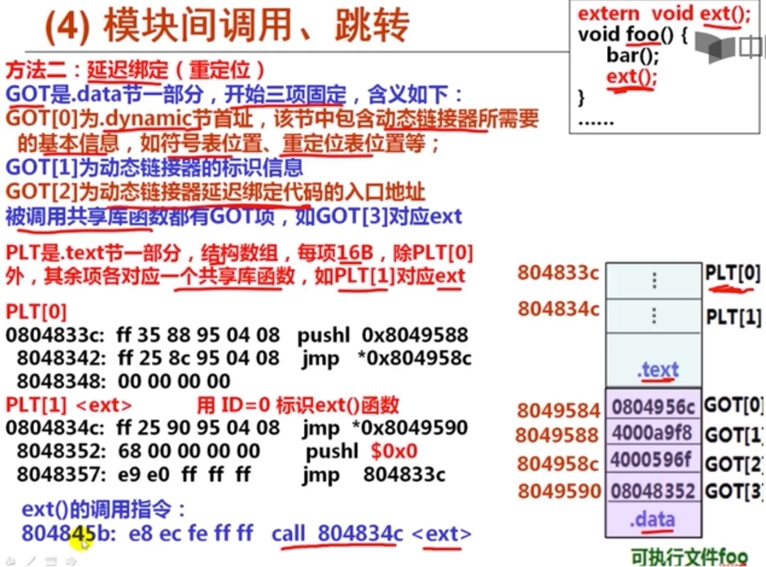 假如主程序需要调用动态链接库lib.so里的1个函数:ext,那么在GOT表里和PLT表里都有1个条目,GOT表里是未来这个函数加载后的地址;而PLT里放的是如何调用这个函数的代码,这些代码是在链接期链接器生成的。