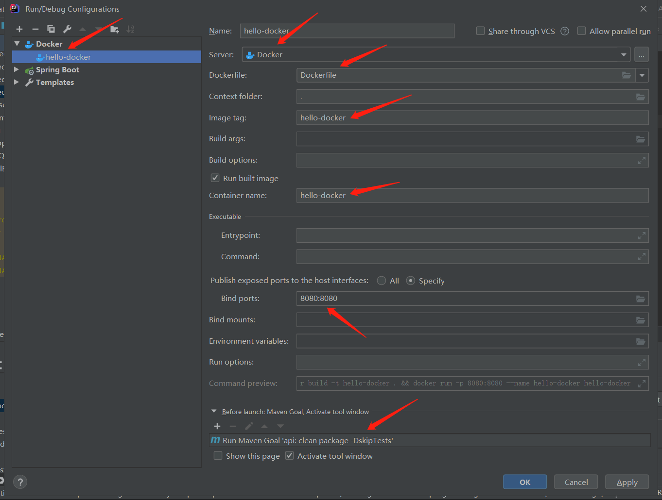 增加镜像部署配置,注意最底部 Maven 命令,clean package -DskipTests,用来生成构建镜像需要的 jar 包;